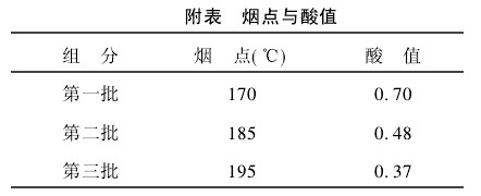 為了進一步證實游離脂肪酸含量與煙點的關系,我們在幾次高級烹調油車間調試中對幾批不合格油進行抽測。