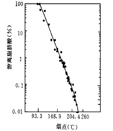 精煉油脂中存在不同含量的游離脂肪酸,游離脂肪酸比甘油酯容易揮發,因此油脂煙點主要取決于游離脂肪酸的含量。游離脂肪酸含量與油脂煙點的關系從圖1[2]中可以反映。顯而易見游離脂肪酸含量越低油脂煙點越高。游離脂肪酸含量在0.05%~0.1%之間時,每降低0.01%時煙點增加緩慢。有關資料表明游離脂肪酸含量為0.1%時煙點為198.9℃[3],游離脂肪酸含量小于0.1%時每降低0.01%都很困難,而煙點增高不明顯,所以煙點在200℃時比較難于提高。