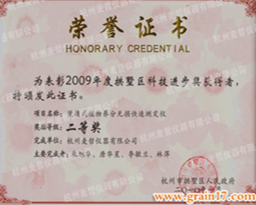 圖為:2009年度拱墅區(qū)科技進(jìn)步二等獎(jiǎng)榮譽(yù)證書(shū)