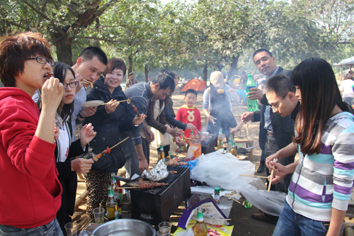 尋找好合適的場地,大家領著各自的任務便忙開了。男同事收拾燒烤攤,美食醬料一一擺放整齊;女同事洗菜切菜,快速而細致。大家邊忙著手里的活邊聊著天,共同享受著這樣一個閑適的周末時光。