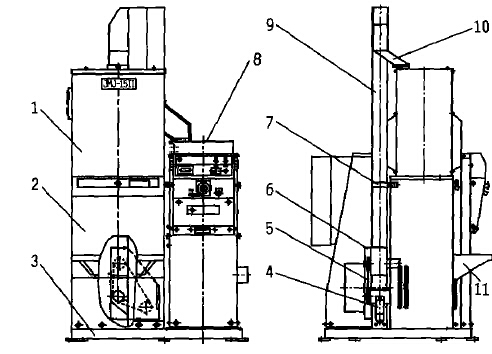 其中架臺上的米斗是加料口, 架臺下部的螺旋輸送機是送料機構,投入口是將螺旋送來的物料轉投到提升機下部的組件。另外還有提升機排出口、皮帶罩、電控箱、操作面板等部件。電控箱裝在精米機后部, 箱內裝置控制元件。操作面板裝在精米機前部,其上設有操作按鈕,可按料位高低自動實現對糙米的加工。該機前部還設有供料開關、精白度旋鈕和流量調整旋鈕等操作調整元件,用來調整開關、大米的精度和白度及適當的流量。最后成品米從排料口排出。整機結構新穎、緊湊、操作方便。
