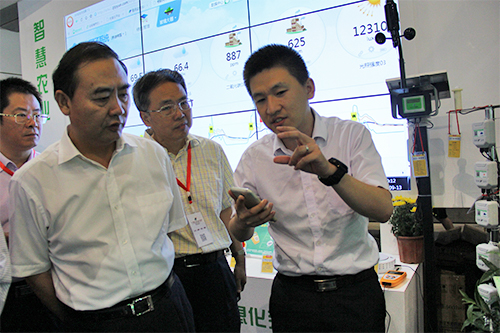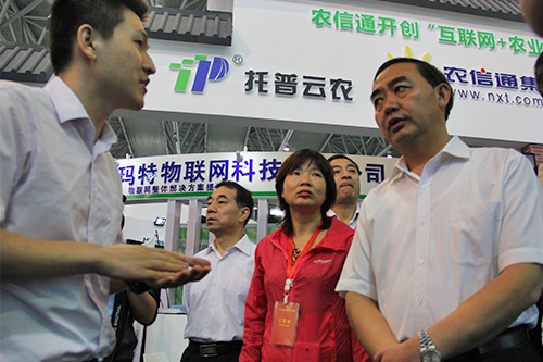 會(huì)議期間,安徽省農(nóng)業(yè)委員會(huì)孫正東主任蒞臨托普云農(nóng)農(nóng)業(yè)物聯(lián)網(wǎng)展區(qū),并細(xì)致觀摩了托普云農(nóng)所展出的大田“四情”監(jiān)控系統(tǒng)、設(shè)施農(nóng)業(yè)監(jiān)控系統(tǒng)、土壤墑情監(jiān)控系統(tǒng)等多種農(nóng)業(yè)物聯(lián)網(wǎng)綜合服務(wù)平臺(tái),以及與之相關(guān)的多種儀器和智能硬件設(shè)備。在參觀過(guò)程之中,孫正東主任詳細(xì)詢(xún)問(wèn)了大田“四情”監(jiān)控系統(tǒng)、遠(yuǎn)程傳輸智能蟲(chóng)情測(cè)報(bào)燈、植物本體傳感器、固定式無(wú)線農(nóng)業(yè)氣象綜合監(jiān)測(cè)站等系統(tǒng)設(shè)備。陳曦經(jīng)理為其一一進(jìn)行介紹。