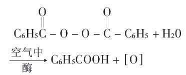 過氧化苯甲酰添加到面粉中水解放出活性氧后,生成的苯甲酸殘留在面粉中。其水解反應式如下:
